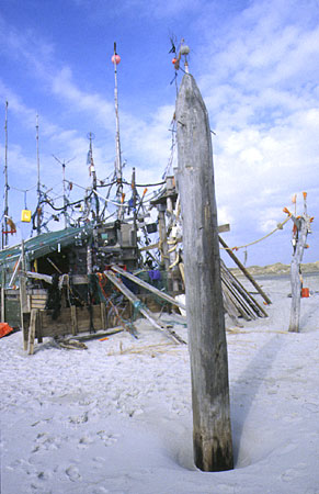 Und außerdem bleibt die Frage, was bei Eintreten der Flut passieren wird. Der Pfosten sieht an der Unterseite ziemlich angefeuchtet aus. Und der dunkle Streifen im Bildhintergrund deutet darauf hin, daß während der Flut die Verbindung zur Insel abgetrennt ist.